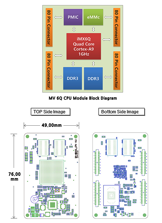 본 제품은 CPU보드에 DDR3 메모리, eMMC Memory, PMIC를 제외한 나머지 모든 기능을 BASE 보드에서 구현 할 수 있도록 board to board connector형태로 만들어져 있다. 아래 그 Block Diagram을 간단히 예시 한다.