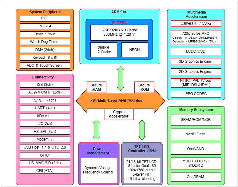 24bit interface, MiPi CSI 및 DSI가 가능하게 되어 있다 . 또한 333Mbps mDDR2까지 지원하는 SDRAM
